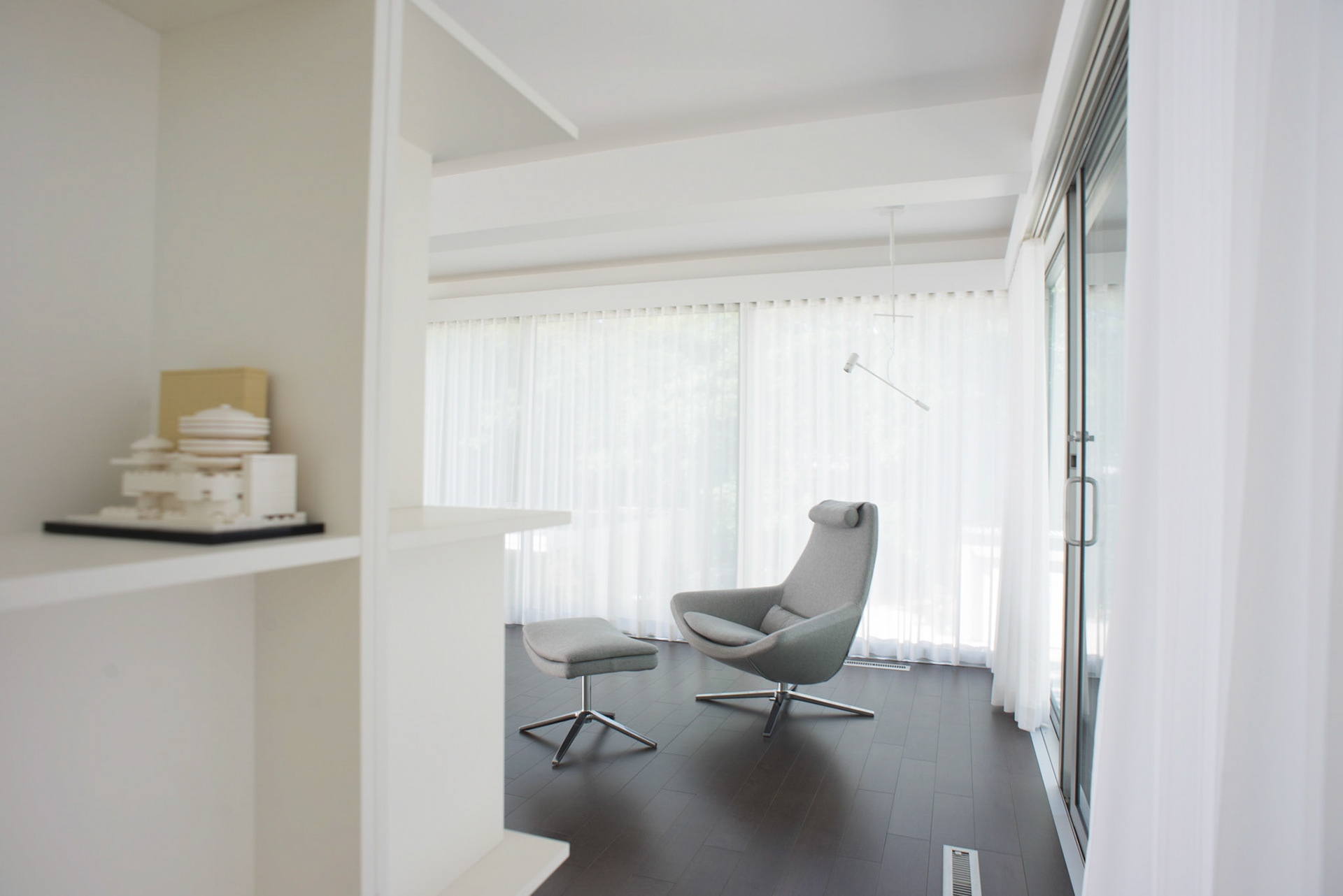 A simple interior palette of materials and white walls allow for dynamic plays of light and shadow throughout the day.